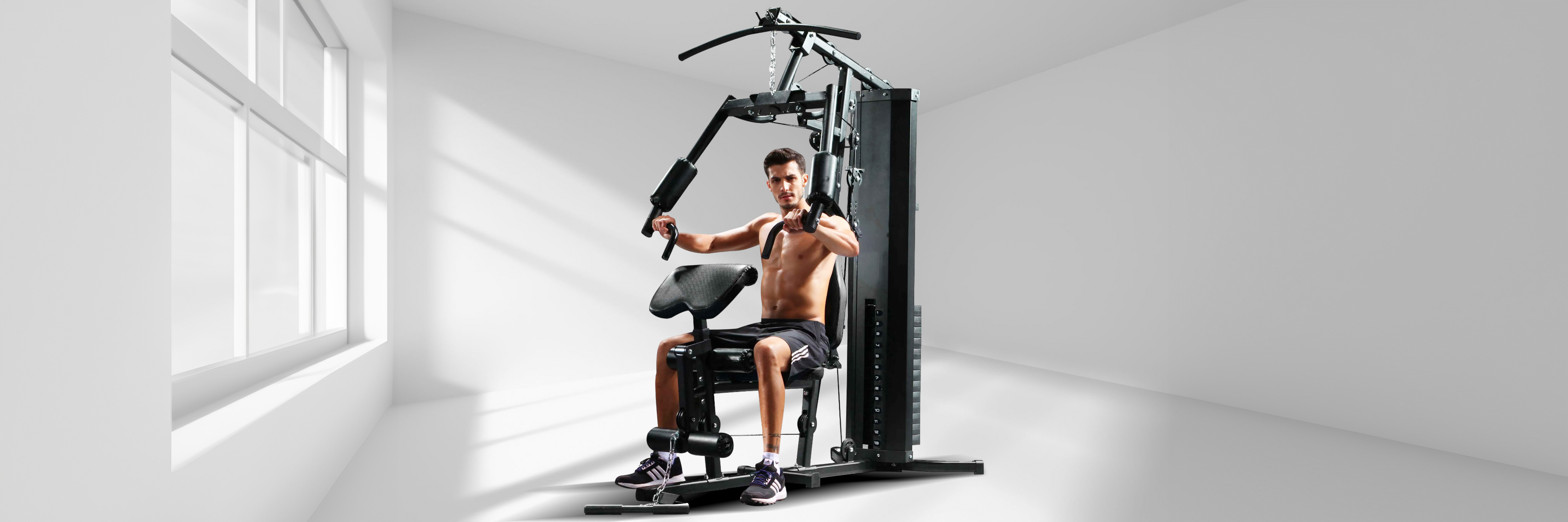 The Axox Fitness Home Gym X1 is a compact yet robust home workout system, featuring a vinyl weight stack, durable aircraft cables, and a sturdy frame. It offers versatile exercises with high and low pulleys, a comfortable seat, and easy-to-handle grips, supporting users up to 125 kg for comprehensive strength training at home. This home gym system is ideal for those looking to perform a variety of exercises at home, combining functionality with durability.
