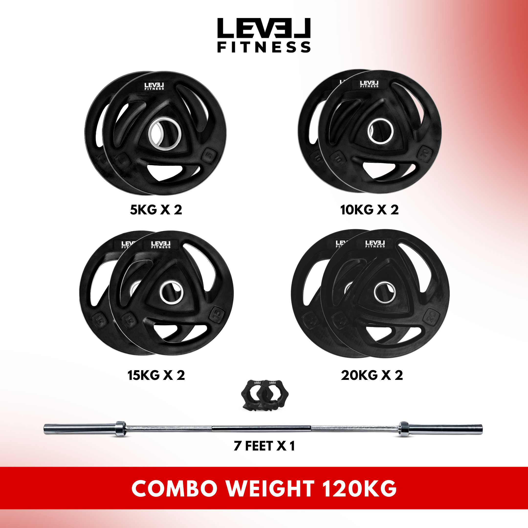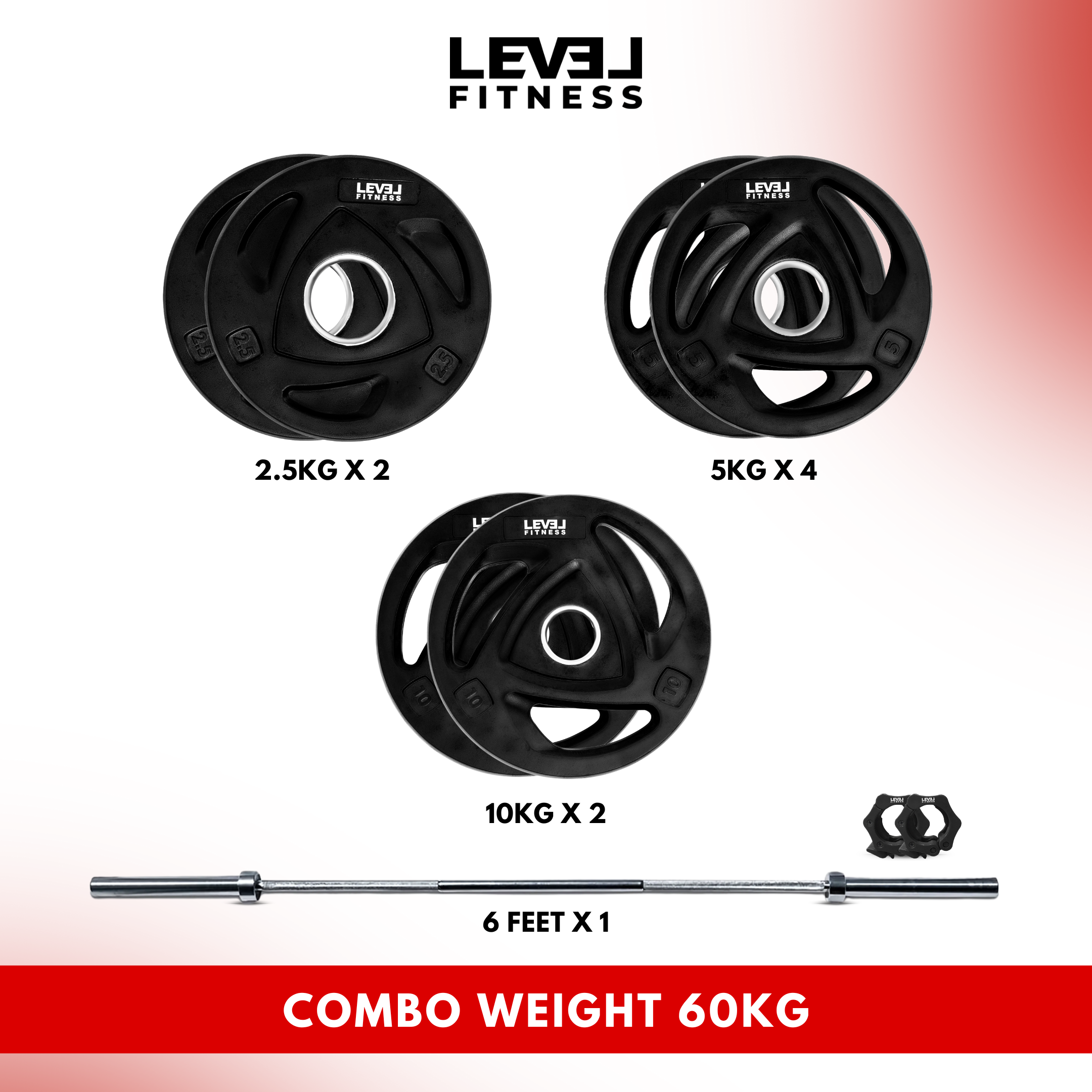 Combo 60KG - 160KG Sets | Level Fitness Tri Grip Olympic Plates with Olympic Barbell