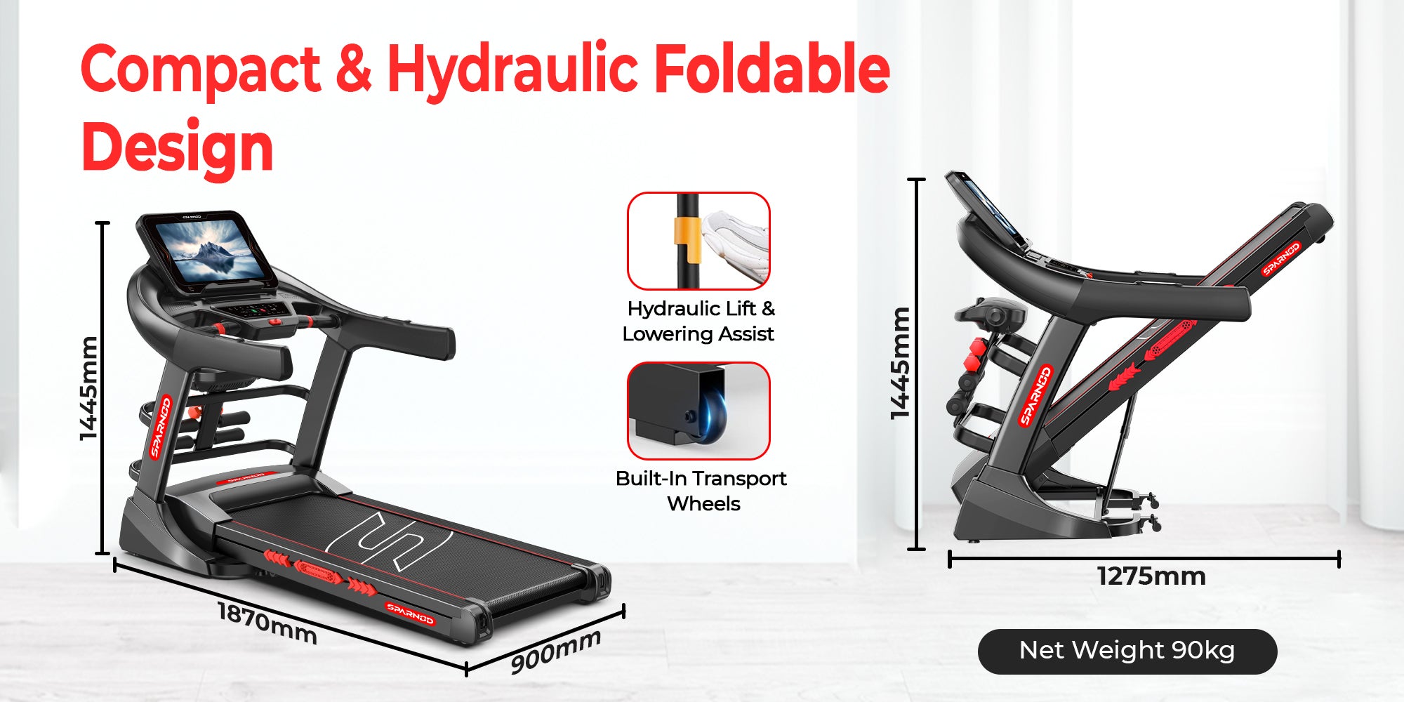Hydraulic Foldable Design – Space-saving hydraulic folding with smooth drop system and transport wheels for easy storage and movement.