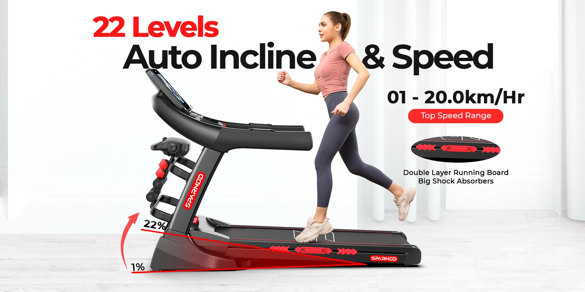 Auto Incline & Shock Absorption – 0-22% automatic incline for intense workouts, paired with rubber shock pads for reduced joint impact.